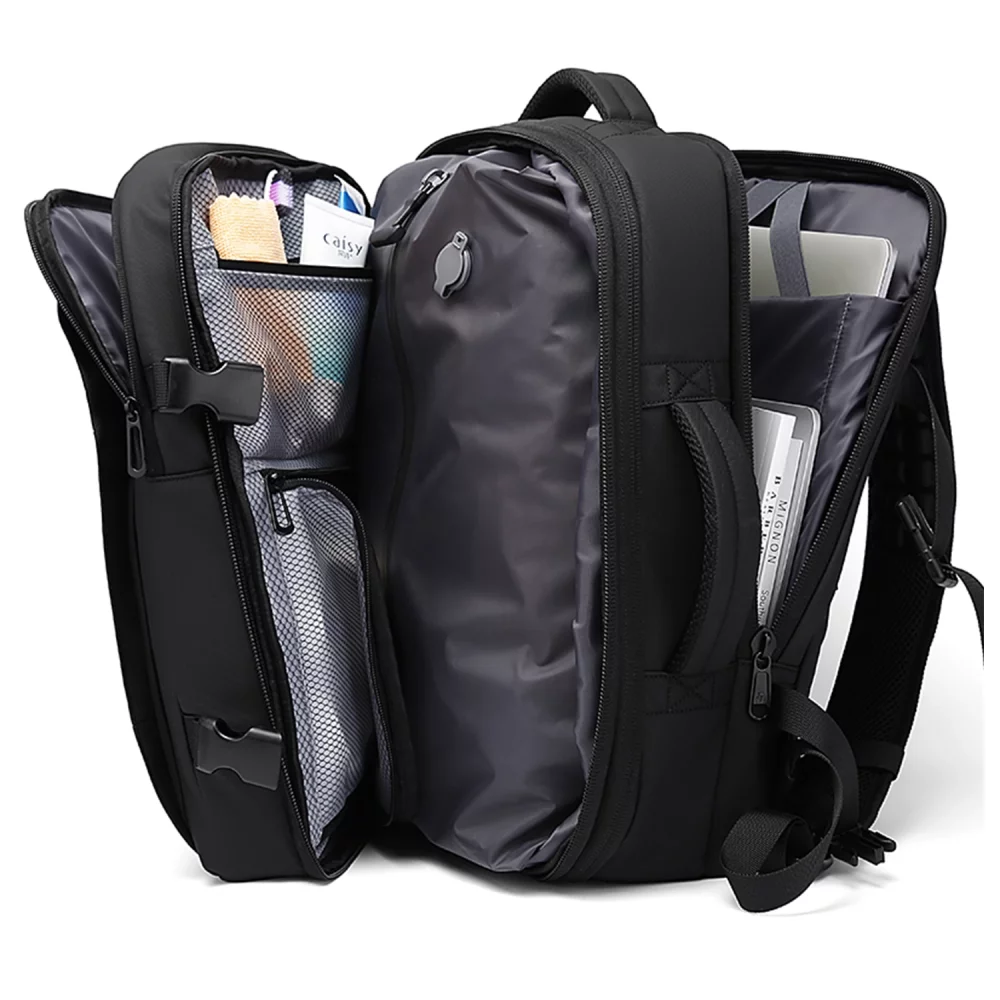 ✅ Główna komora plecaka - otwierana jak walizka, wyposażona w przegrodę do pakowania próżniowego (w zestawie znajduje się elektryczna pompka próżniowa) i dwie wodoodporne kieszonki na zamek, które idealnie nadadzą się do przechowywania kosmetyków.