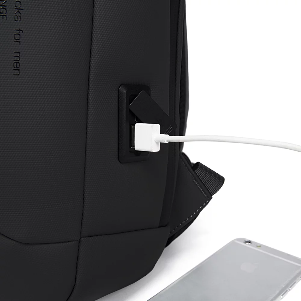 ✅ Zewnętrzny port USB pozwala na podłączenie urządzenia do plecaka, podczas gdy wewnątrz plecaka znajduje się kabel, który łączy port USB z powerbankiem. Dzięki temu urządzenia, takie jak telefon, można ładować w trakcie podróży, bez wyciągania powerbanka.