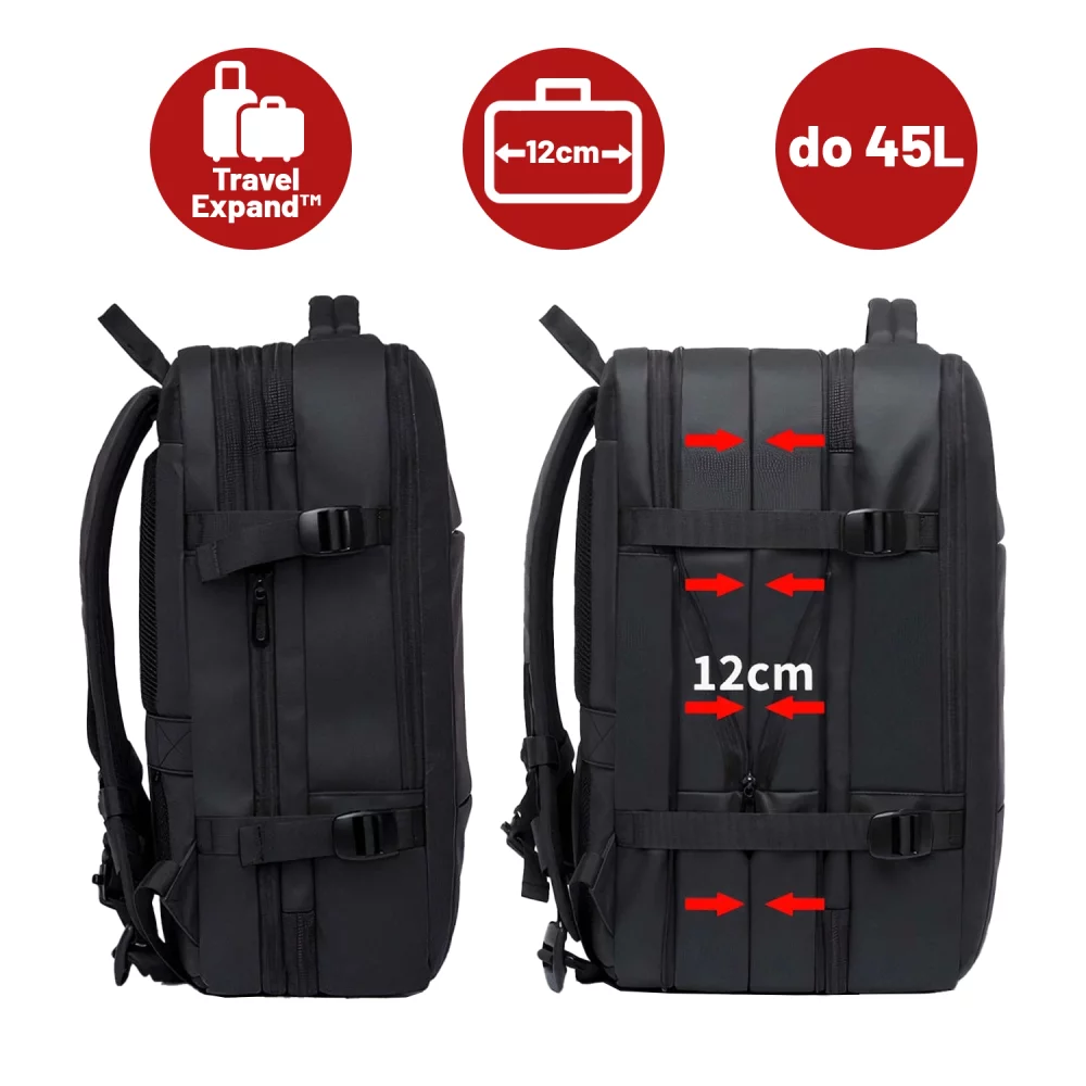 ✅ Dzięki systemowi TravelExpand™ plecak zwiększa pojemność o 12 cm, co daje aż 45 litrów przestrzeni. Możesz spakować dodatkowe buty, bluzy czy zakupy bez konieczności kupowania dodatkowego bagażu. To oszczędność nawet 200 zł za dopłatę do walizki w tanich liniach.