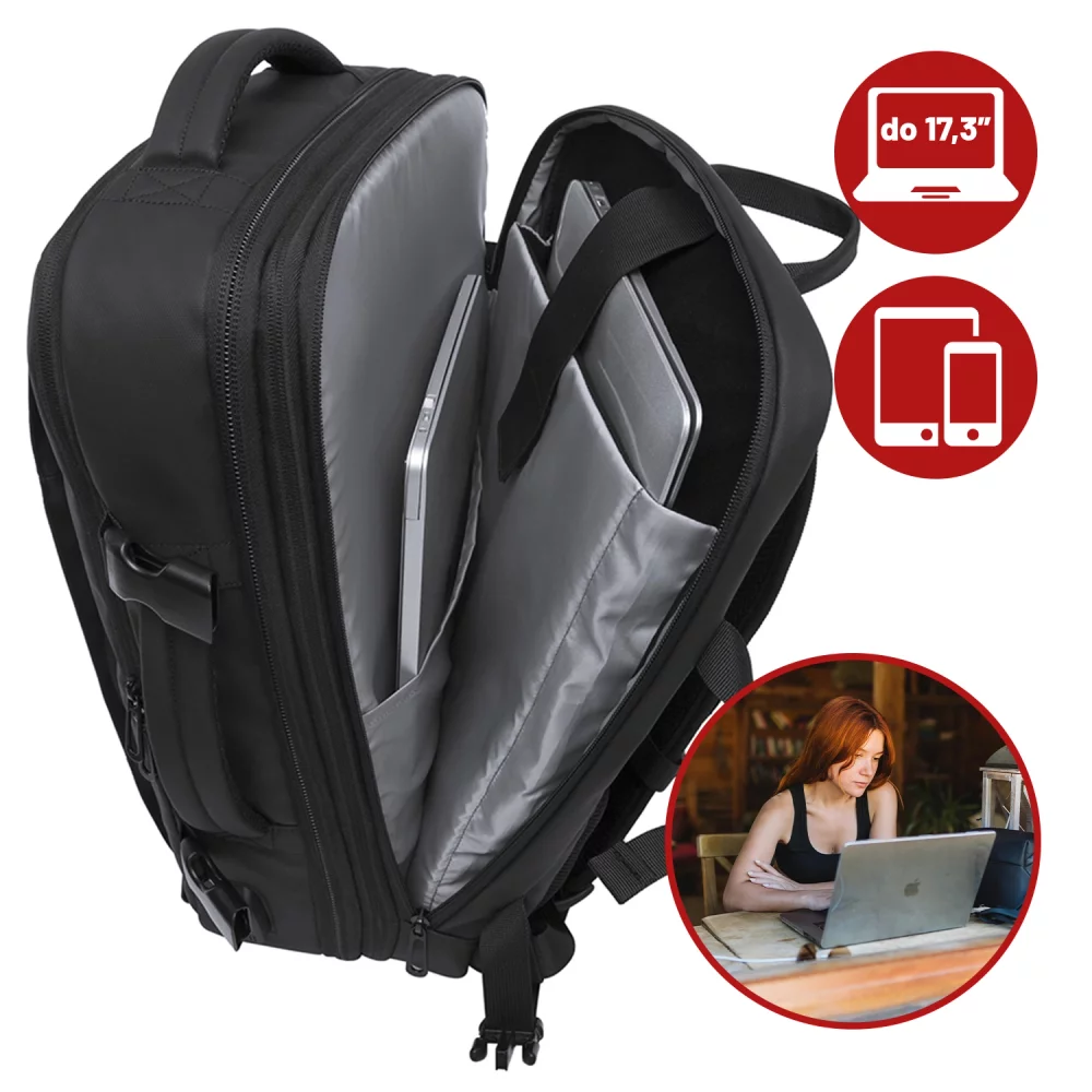 ➕ Praca i delegacje – dedykowana komora na laptop 17,3" i dokumenty sprawiają, że plecak staje się mobilnym biurem.