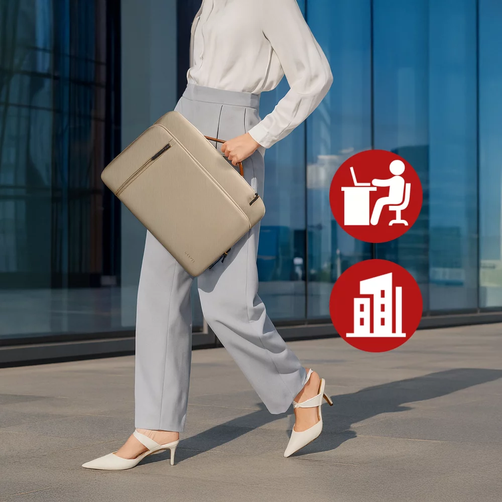 ✅ Wnętrze torby mieści laptopa 15.6 cali, który jest chroniony przez miękką, amortyzującą warstwę. Elegancka rączka z ekoskóry zapewnia pewny, wygodny chwyt i dodaje torbie profesjonalnego charakteru — idealna do pracy, uczelni i spotkań biznesowych.